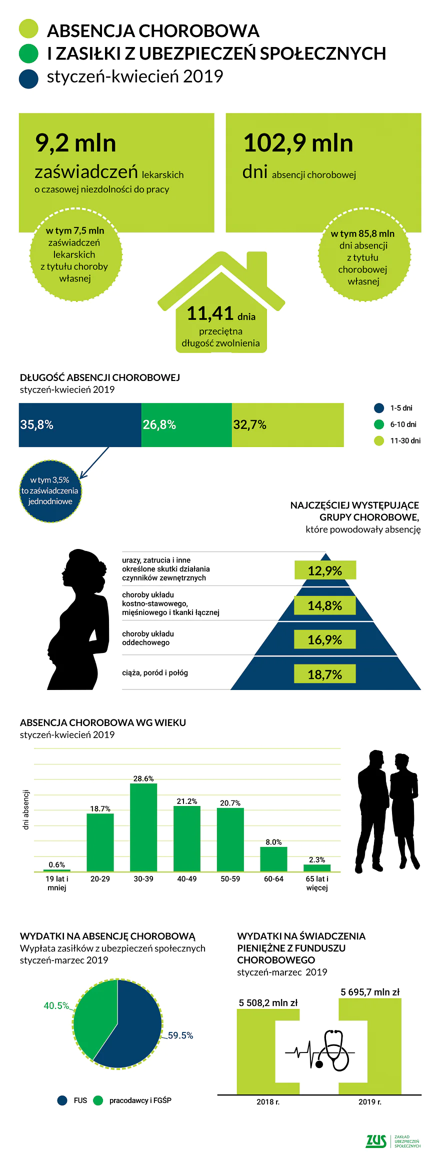 Powodowany ciekawością zajrzałem na kilka stron internetowych, w tym stronę z raportami ZUS. Obraz, który zobaczyłem nie napawa mnie optymizmem. Dane ZUS wskazują, że w okresie od stycznia do kwietnia 2019 roku wystawiono 9,2 mln zaświadczeń lekarskich o czasowej niezdolności do pracy. Najwięcej, bo 60% zwolnień obejmowało od 1 do 10 dni nieobecności, kolejne 33% to zwolnienia na okres od 11 do 30 dni absencji. To oznacza, że w 93% przypadków kosztami chorób pracowników jest obarczony pracodawca.