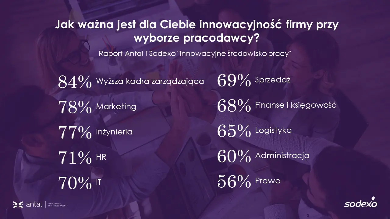 Innowacyjność, przy wyborze miejsca pracy najbardziej ceni wyższa kadra zarządzająca (84%). Jest kluczowa także dla 77% inżynierów i osób pracujących w marketingu. Na innowacyjność najmniej zwracają uwagę prawnicy (56%) i administracja (60%)