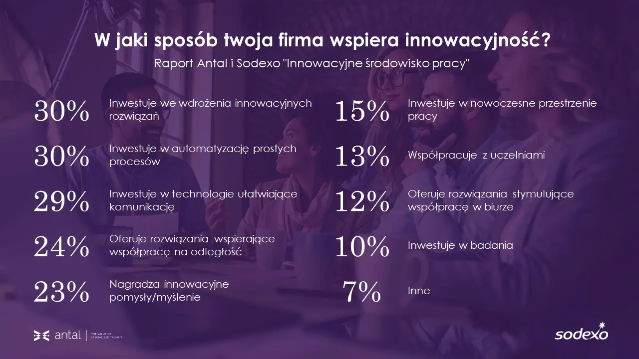 Innowacyjne działania mają doprowadzić do poprawy konkurencyjności konkretnych przedsiębiorstw, co może mieć wpływ na rozwój gospodarczy regionów czy nawet państw. Są wykorzystywane w każdej dziedzinie gospodarki. Ich poszukiwanie i stosowanie jest z jednej strony bardzo ryzykowne i nieprzewidywalne, jednak z drugiej jest też szansą dla przedsiębiorstwa na utrzymanie a nawet wzmocnienie pozycji rynkowej. Antal oraz Sodexo Polska przygotowali raport “Innowacyjne środowisko pracy”, które zostało przeprowadzone metodą CAWI na próbie 1 016 specjalistów i menedżerów w terminie 8-18 września 2022 roku. Patronami raportu są Pracodawcy RP oraz SPCC