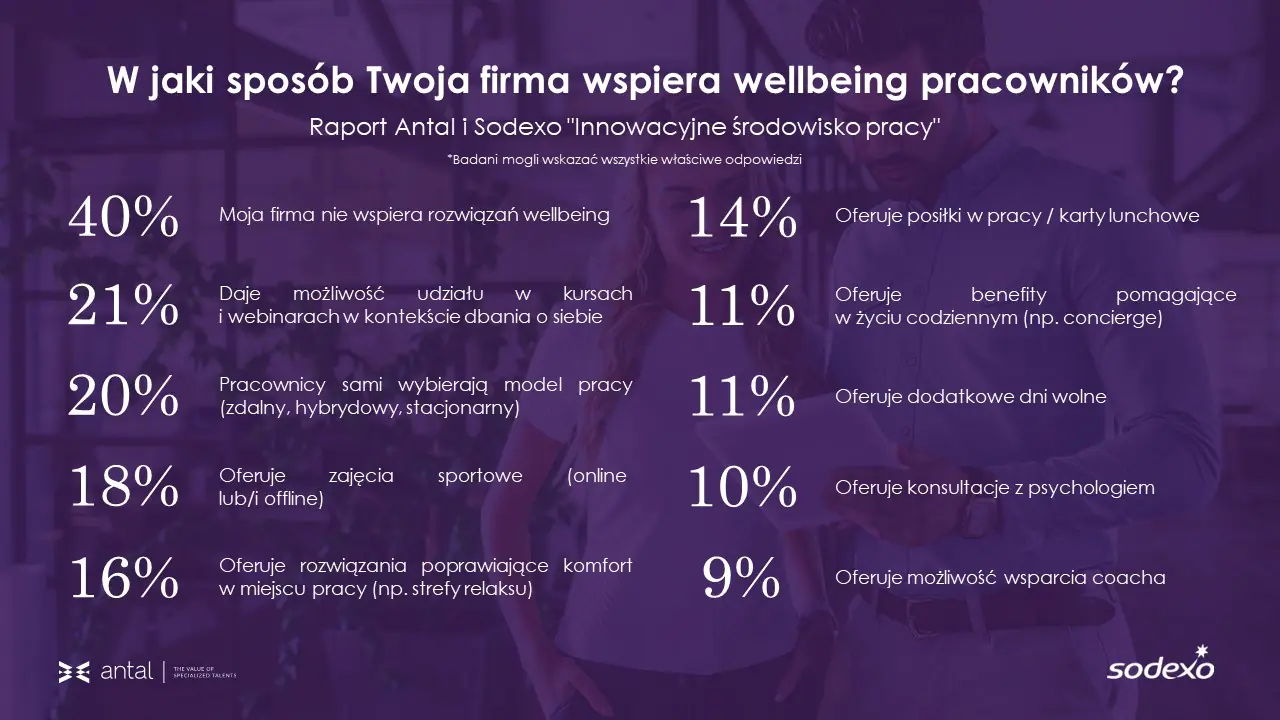 W czasach, gdy coraz więcej mówi się o wellbeingu pracownika okazuje się, że aż 40% firm nie wspiera takich rozwiązań.  Co 5 firma daje możliwość udziału w kursach i webinarach w kontekście dbania o siebie, zajęciach sportowych lub pracownicy sami wybierają elastyczny model pracy (zdalny, hybrydowy, stacjonarny). 15% firm oferuje rozwiązania poprawiające komfort w miejscu pracy lub posiłki czy karty lunchowe. Co dziesiąty ankietowany wymienia, że firma oferuje konsultacje z psychologiem, wsparcie coacha lub dodatkowe dni wolne.