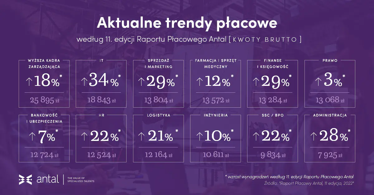 Specjaliści i menedżerowie zarządzania zasobami ludzkimi zanotowali wzrost wynagrodzeń o 22% – średnio wyniosło ono 12 524 zł brutto. Średnie miesięczne wynagrodzenie brutto wyniosło tu 13 284 zł. Dynamika wzrostu wynagrodzeń w centrach usług wspólnych także rośnie (22%) - dzięki średniemu miesięcznemu wynagrodzeniu w wysokości 9 834 zł brutto. W logistyce średnio został odnotowany wzrost o 21% i miesięczna pensja brutto wyniosła 12 164 zł.  W branży farmaceutycznej i sprzętu medycznego średnie miesięczne wynagrodzenie wyniosło w badanym okresie 13 572 zł brutto (wzrost o 12%). Na stanowiskach inżynieryjnych odnotowano wzrost o 10% – średnie miesięczne wynagrodzenie wyniosło 10 611 zł brutto. W bankowości i ubezpieczeniach wyniosło ono 12 724 zł brutto (wzrost o 7%). Prawnicy, którzy zyskali najwięcej w początkach pandemii, obecnie odnotowali wzrost przeciętnych płac o jedynie 3% Ich średnie miesięczne wynagrodzenie wyniosło 13 068 zł brutto.  Płace przedstawicieli administracji wzrosły o 28% w stosunku do poprzedniej edycji raportu Antal – ich przeciętnie oferowane wynagrodzenie wyniosło 7 925 zł netto. Mimo znacznego wzrostu jest to wciąż najniżej opłacana grupa z wymienionych badaniu. Na tle ostatnich lat dynamika wzrostu wynagrodzeń jednak rośnie.