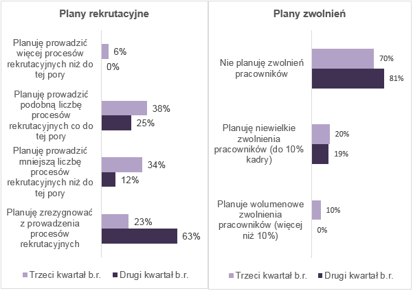 Pracodawcy w dobie pandemii dbają także o zaangażowanie pracowników oraz wizerunek organizacji. Działają ostrożnie i nie podejmują pochopnych decyzji, które miałyby się przyczynić do zachwiania filarów działalności firmy. Co piąty pracodawca planuje redukcje zatrudnienia kadry kierowniczej czy specjalistycznej, a zaledwie co dziesiąty deklaruje większe zwolnienia - powyżej 10% dotychczas zatrudnionej kadry. Optymistycznie wygląda jednak porównanie wyników badania do poprzedniego, przeprowadzonego w kwietniu br. Wówczas 63% pracodawców z sektora produkcyjnego i logistycznego deklarowało rezygnację z prowadzenia rekrutacji, a obecnie już tylko 23%. Wzrost liczby ofert pracy daje zdecydowanie większe możliwości na znalezienie atrakcyjnej oferty kandydatom, którzy zostali zmuszeni do wyjścia na rynek.