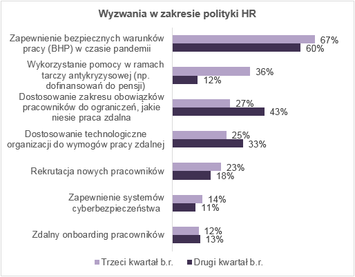 Rośnie liczba pracodawców, dla których zapewnienie bezpieczeństwa pracownikom w miejscu pracy jest kluczowym wyzwaniem (67%). Ponad połowa organizacji wskazuje, że dostosowanie zakresu obowiązków do ograniczeń spowodowanych pracą zdalną oraz wymogów z tym związanymi jest ich głównym celem.