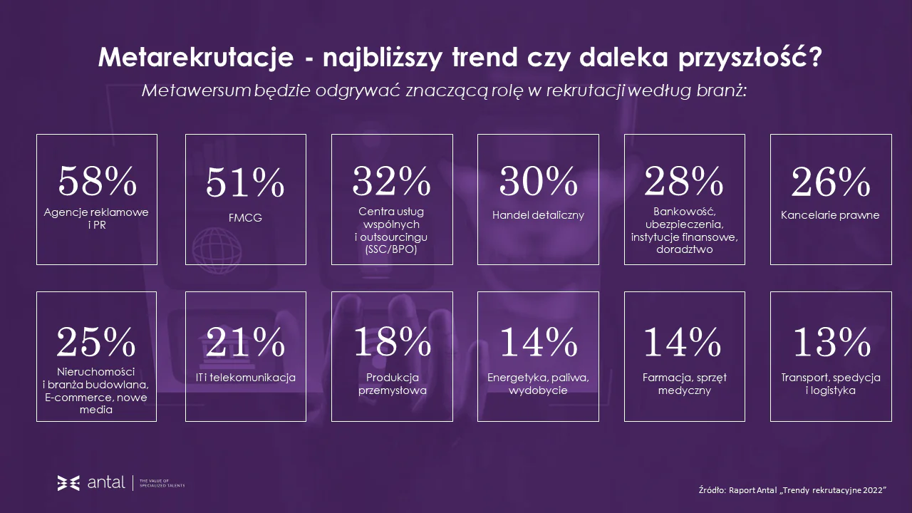 Antal, podczas Europejskiego Forum Nowych Idei (EFNI) opublikował najnowszy raport “Trendy Rekrutacyjne 2022”. Wynika z niego, że aż 78% badanych osób odpowiedzialnych za zarządzanie kapitałem ludzkim ocenia, że w przyszłości więcej niż 10% procesów rekrutacyjnych będzie realizowanych w metawersum.