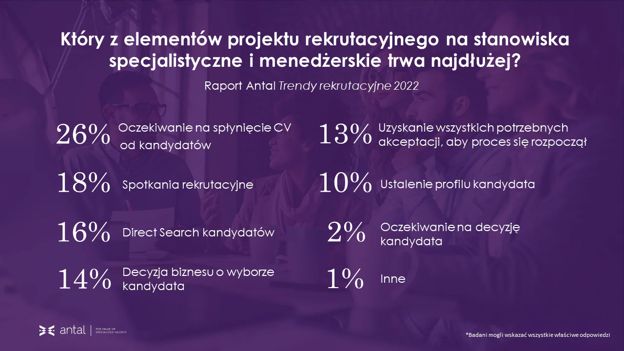 Na dynamicznie zmieniającym się rynku pracy istotną rolę odgrywa także czas trwania procesu rekrutacyjnego. Średnia długość projektu od zgłoszenia zapotrzebowania na wakat w organizacji do zatrudnienia specjalisty lub menedżera to cztery tygodnie. Z perspektywy kandydata, który w obecnych realiach aktywnie szuka pracy, często ten czas jest zbyt długi. Okazuje się, że dzisiaj na rynku wygrywa ten, kto sprawnie i możliwie najszybciej przeprowadzi rekrutację. A konkurencja wciąż jest duża i kandydaci mogą wybierać w ofertach - mówi Aleksandra Jędrzejczyk, Senior Consultant, Antal SSC/BPO.