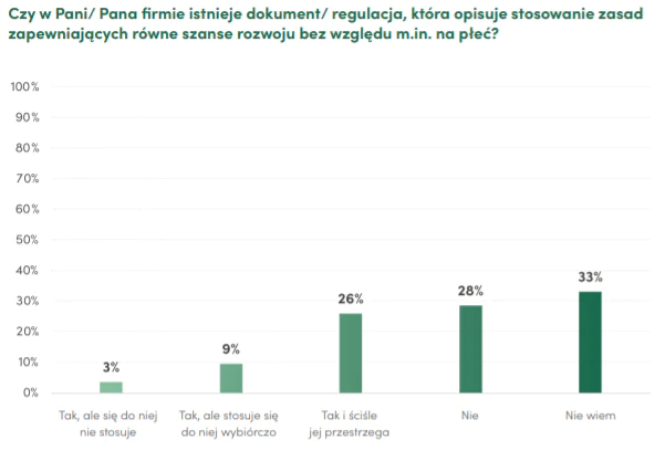 58% respondentów raportu “Kobiety w finansach” uważa, że płeć ma wpływ na możliwość awansu. Wskazuje to na fakt, jak wiele jeszcze do zrobienia w tym obszarze jest i jak wolno sytuacja się poprawia. Przed pracodawcami stoi wyzwanie polegające na zbudowaniu przekonania, że rozwój i kariera nie mają płci. 38% respondentów deklaruje, że ich firma wdrożyła regulację wewnętrzną dotyczącą polityki równych szans.