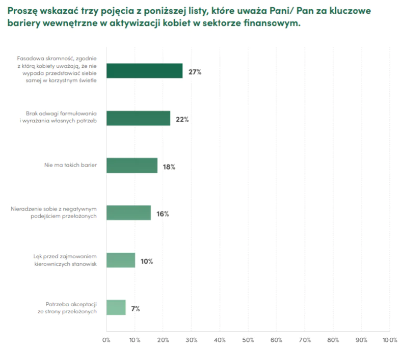 W przypadku oceny potrzebnych form wsparcia brakuje wyraźnych preferencji. Najbardziej niezbędne wydają się programy rozwojowe oraz szkolenia i kursy dla kobiet ze średnim wynikiem 3,7 w pięciostopniowej skali. 83% badanych ocenia, że w sektorze finansowym występują bariery mające wpływ na przebieg kariery zawodowej kobiet – to mniej niż w porównaniu z rokiem 2019, gdy odsetek ten wynosił 94%. Do największych barier zewnętrznych respondenci zaliczyli uwikłanie kobiet w tradycyjne role – 32% wskazań oraz prawodawstwo (urlop macierzyński/ tacierzyński) – 17%. Do największych barier wewnętrznych respondenci zaliczyli: fasadową skromność, zgodnie z którą kobiety uważają, że nie wypada przedstawiać siebie samej w korzystnym świetle (27% wskazań), brak odwagi formułowania i wyrażania własnych potrzeb (22% wskazań).