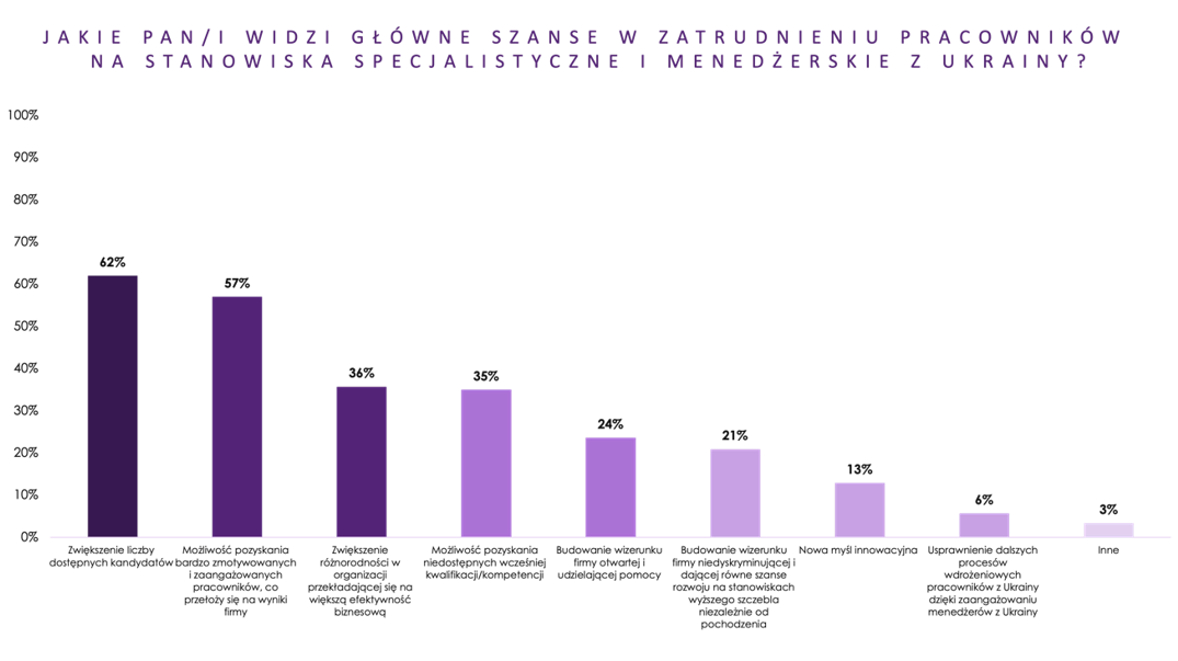 77% pracodawców w badaniu przeprowadzonym przez Antal deklaruje chęć zatrudnienia pracowników z Ukrainy również na stanowiskach specjalistycznych i menedżerskich. Wakaty czekają w praktycznie wszystkich działach firm. Możliwość zatrudnienia ukraińskich pracowników według badanych przełoży się zarówno w krótko jak i długoterminowej perspektywie pozytywnie na polski rynek pracy.