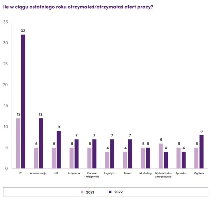 Badanie Antal pokazało rosnącą liczbę ofert pracy dla specjalistów i menedżerów. Otrzymują średnio 8 ofert pracy rocznie w porównaniu do 5 ofert w 2021 roku. Wojna na Ukrainie nie odbiła się na zapotrzebowaniu firm na nowych pracowników, a pandemia i związane z nią restrykcje gospodarcze wprowadziły tylko chwilowe zawirowania.