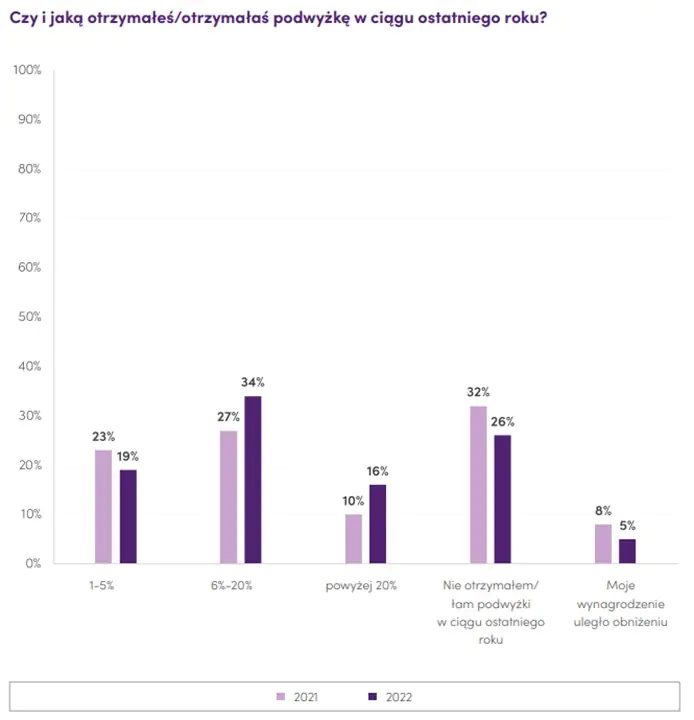 Niemal 70% badanych otrzymało podwyżki co oznacza wzrost do ubiegłego roku o 10 punktów procentowych. Rośnie też udział tych wysokich wzrostów pensji - powyżej 20% rok do roku. Rynek kandydata kwitnie i pracownicy z tego korzystają. Inflacja daje im dodatkowe argumenty w negocjacjach.