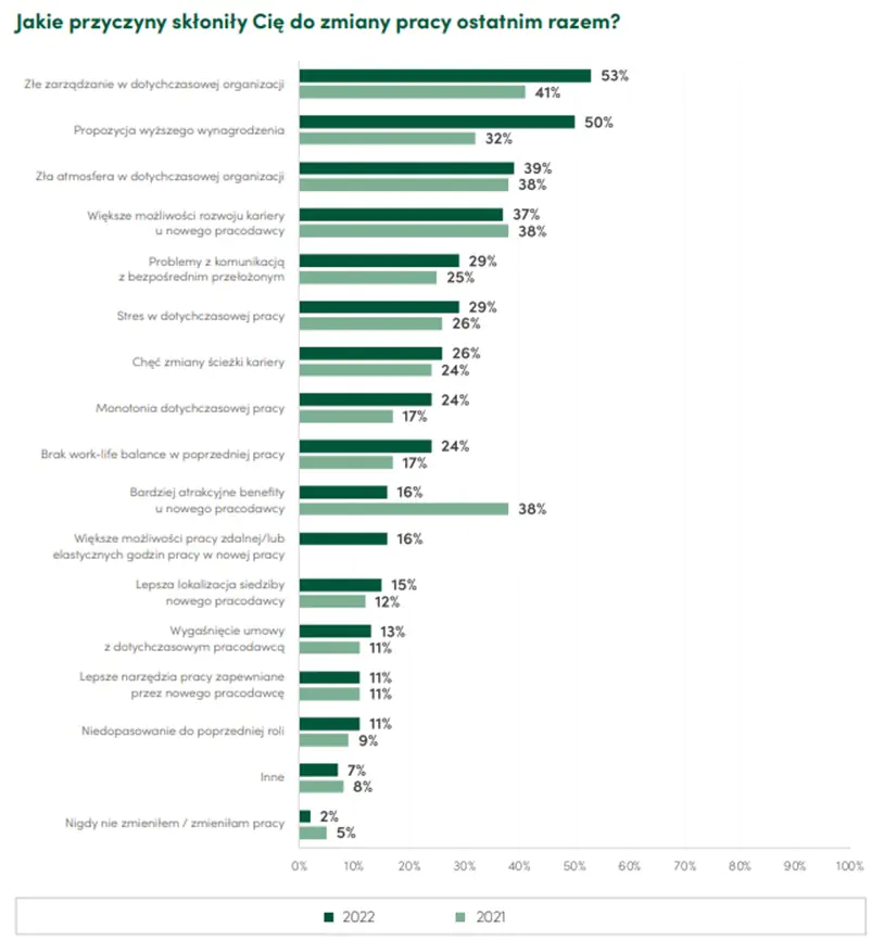 Kandydaci szukają bardziej atrakcyjnych finansowo ofert pracy w obliczu rosnących kosztów życia związanych z inflacją i wysokimi stopami procentowymi. Oczekują średnio zwiększenia płacy 20-30%. Propozycja wyższego wynagrodzenia jest jednak motywacją do faktycznej zmiany pracy tylko dla połowy badanych. Z raportu Antal wynika, że na czele listy powodów wpływających na zmianę pracy znajduje się złe zarządzanie w organizacji. Ten czynnik był powodem odejścia z firmy dla 53% badanych. Wskazuje to na konieczność zmian w przedsiębiorstwach, w zakresie dobrej komunikacji z pracownikami, stylu zarządzania oraz kultury pracy. Zła atmosfera panująca w pracy bądź rosnący stres związany z wykonywaniem obowiązków potrafi być znaczącym demotywatorem w rozwoju kariery.