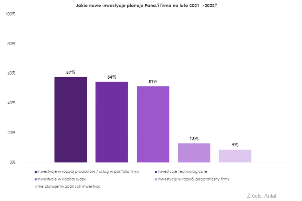 Branża produkcyjna, mimo pandemii nie stanęła w miejscu. Można zauważyć ciągły rozwój przedsiębiorstw i powstawanie centr badawczo-rozwojowych czy parków maszynowych. 70% przedstawicieli tego sektora, w nowym roku chce inwestować w technologie. Nowe narzędzia to niższe koszty produkcji, zapewnienie odpowiedniej jakości, wysoka efektywność i różnorodność asortymentu. Rosnące oczekiwania klientów i zwiększająca się konkurencja powodują, że przemysł musi być ulepszany cały czas. W osiągnięciu zadawalającego wyniku pomoże cyfryzacja i informatyzacja produkcji. 56% respondentów chce zwrócić swoje inwestycje w stronę rozwoju produktów w portfolio firmy. Natomiast 46% w kapitał ludzki, a najmniejsza część (14%) w rozwój geograficzny przedsiębiorstwa.