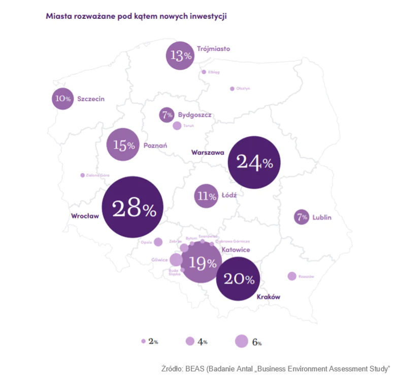 13% badanych planuje inwestycje w rozwój regionalny. Największym zainteresowaniem cieszą się takie miasta jak: Wrocław (28% wskazań), Warszawa (24% wskazań) oraz Kraków (20%). W tym roku na czoło wysuwają się również Katowice (19% wskazań).