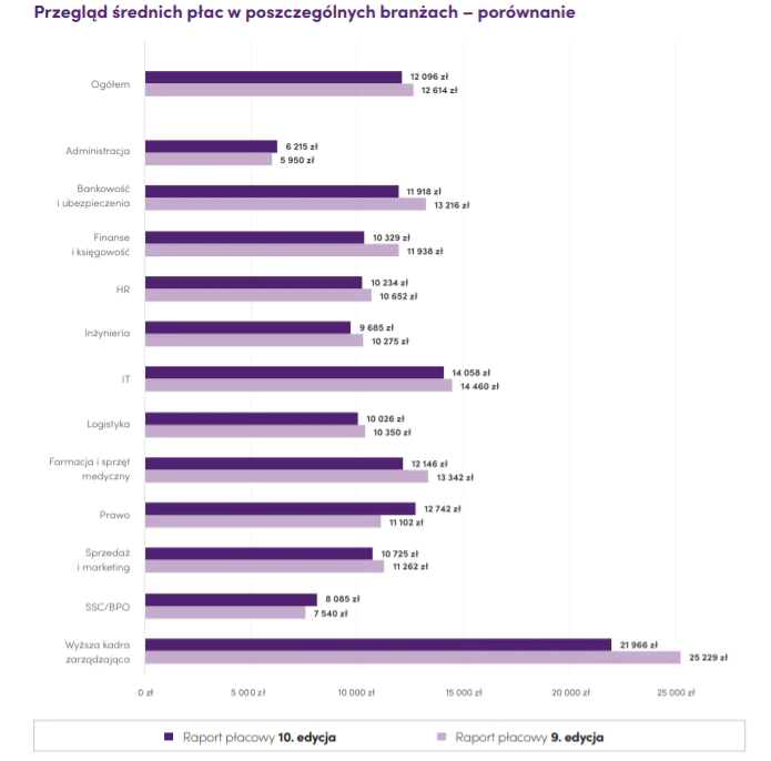 Najwyższy spadek płac wśród badanych grup odnotowują przedstawiciele finansów i księgowości (13%). Tak samo wygląda sytuacja wyższej kadry zarządzającej – top menedżerowie odnotowali spadek wynagrodzeń o 13% – średnie wynagrodzenie miesięczne wyniosło w tej grupie 21 966 zł brutto. Na spadek pensji wpłynęły przede wszystkim niższe realizowane i zakładane wyniki firm, które bezpośrednio przekładają się na wysokość premii i prowizji kadry zarządzającej.