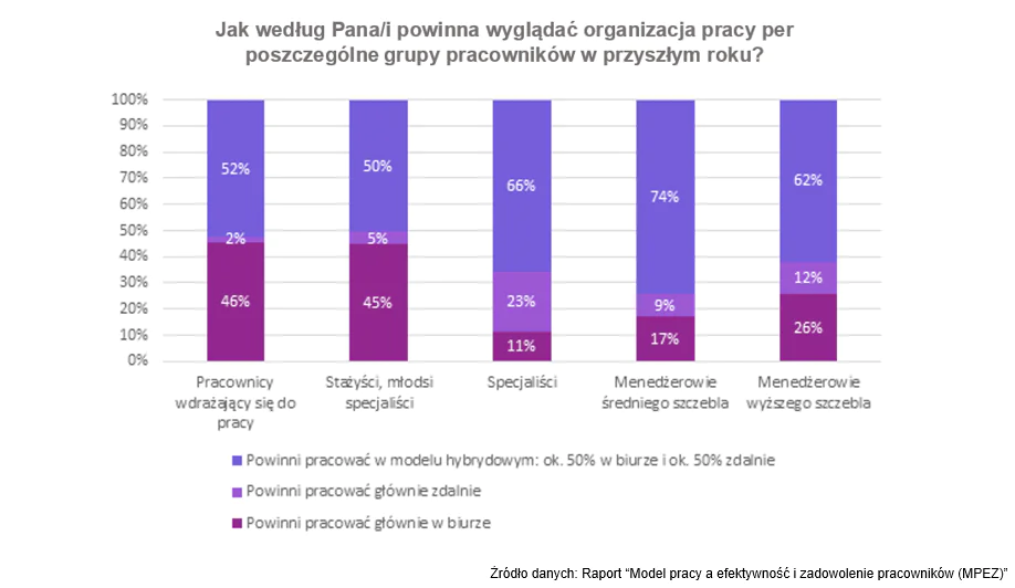 Pracodawcy deklarują, że mimo iż model hybrydowy nie jest idealnym rozwiązaniem w ich firmach będzie nadal on dominował (77%) wskazań. Grupy, od których wymagana jest częstsza obecność w biurze, to osoby wdrażające się do organizacji, stażyści i młodsi specjaliści, a także pracownicy front office. To będzie wpływało również na zmianę roli biura – przede wszystkim jako wizytówki firmy w oczach przyszłych pracowników oraz klientów, a także jako miejsca wspierającego onboarding i integrację, w szczególności nowych pracowników. Ważne będą jakość wyposażenia, wygląd biura i dogodna lokalizacja, które ułatwią rekrutację i podtrzymywanie kontaktów biznesowych.