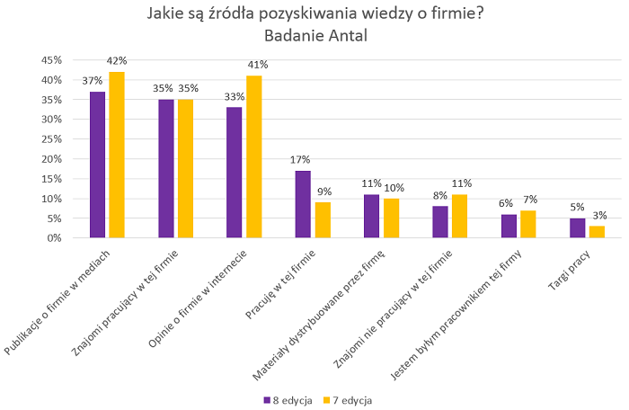 Respondenci zapytani o źródła pozyskiwania wiedzy na temat pracodawców, coraz częściej zaznaczają odpowiedź: „pracuję w tej firmie”. W latach 2015-2016 to kryterium odnotowało 9% zaznaczeń. Porównując do bieżącego raportu, możemy zaobserwować przyrost wartości tej odpowiedzi aż o 8 punktów procentowych. Oznacza to, że obecny pracodawca jest jednocześnie tym najbardziej pożądanym wśród pracowników, którzy nie tylko mają chęć pozostania w swojej organizacji, ale również promują swoje firmy w mediach społecznościowych i w rozmowach z kolegami po fachu.