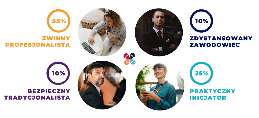 Niezwykle ciekawy jest procentowy udział typów osobowości wśród polskich pracowników. Zwinni Profesjonaliści stanowią zdecydowaną większość, bo aż 55% pracowników w kraju. Ten typ reprezentuje nieco częściej mężczyzna niż kobieta (57% do 52%) i są to głównie przedstawiciele sprzedaży (aż 76%) oraz wyższej kadry zarządzającej (59%), prawnicy i HR-owcy (57%). Branże, w których najczęściej spotkasz Zwinnego Profesjonalistę, to: Agencje marketingowe (100%), Ubezpieczenia (86%) Handel detaliczny (73%), Farmacja (71%).